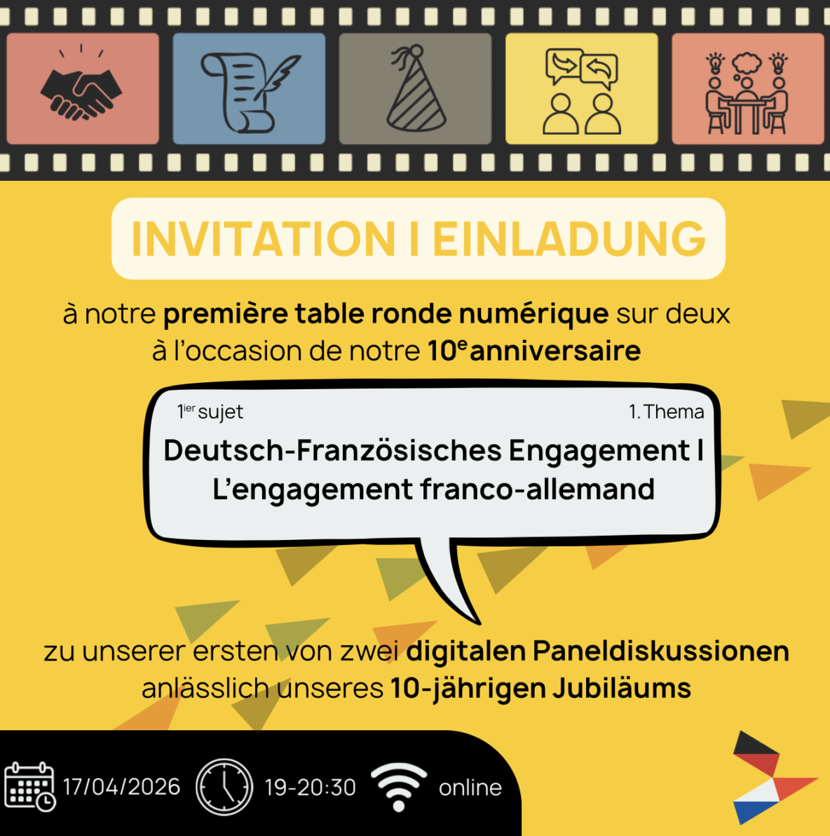 À l’occasion de son 10ème anniversaire, la CFAJ organise en 2026 quatre événements commémoratifs, dont une table ronde en ligne sur le thème « L’engagement franco-allemand », le 17 avril 2026 à 19 heures. 🇫🇷🇩🇪