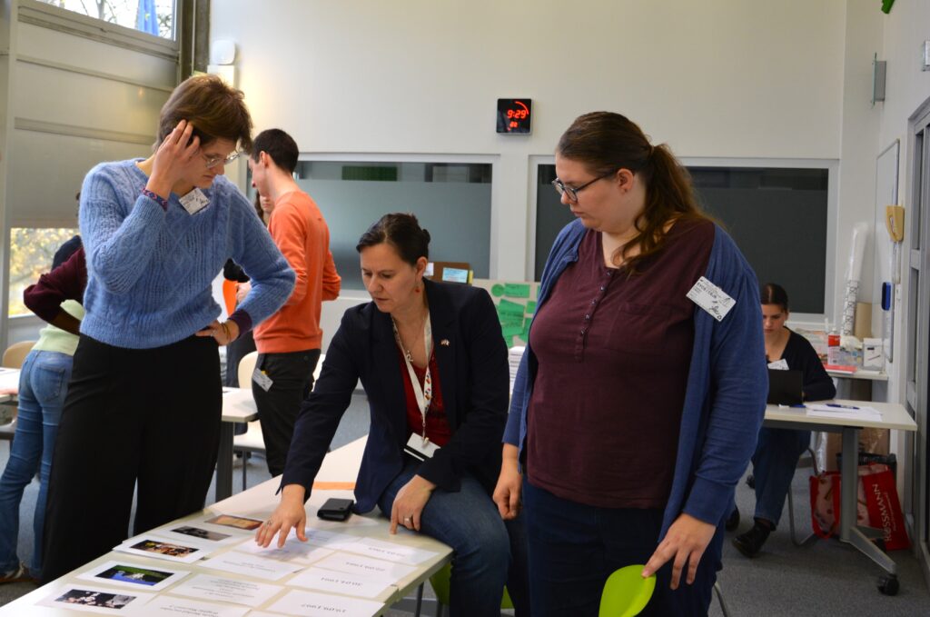 Le troisième atelier portait sur le travail associatif transfrontalier et européen. Après avoir partagé leur rapport à l’Europe et leurs expériences passées au sein de projets internationaux, trois bénévoles et un·e volontaire du Mouvement Européen et des Jeunes Européen·ne·s de Strasbourg ont présenté leur travail à caractère européen. Les invité·e·s sont resté·e·s disponibles et en tant qu’expert·e·s pour la phase suivante qui consistait à développer des projets en petits groupes. Des idées innovantes ont émergé dans de nombreux domaines tels que la littérature, les mangas, les rencontres informelles, les Interrail, l’environnement et les jeux. Dans le projet “Interrail for Youth”, des jeunes de 12 à 18 ans explorent les valeurs européennes et découvrent différentes villes européennes pendant un an en train. Dans le cadre du projet « Histoire sous les étoiles », destiné aux familles francophones et germanophones, des histoires pour enfants sont lues en allemand et en français dans un planétarium, suivies d’un goûter.