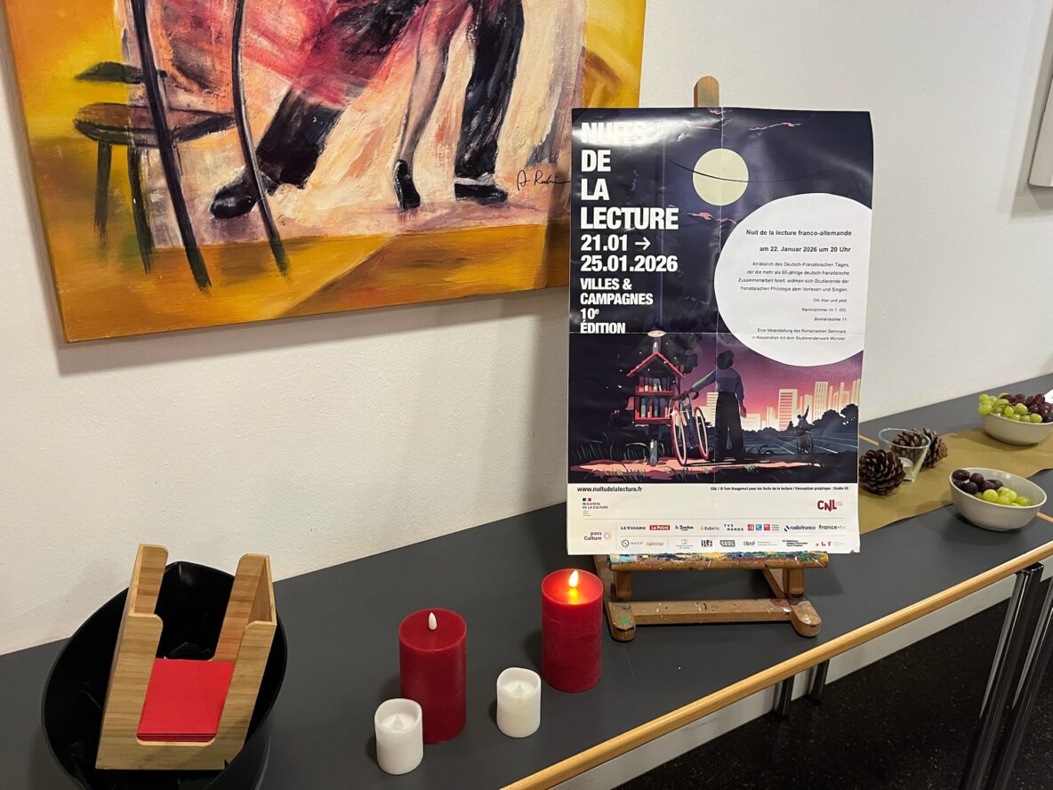 Am 22. Januar eröffnete Maïa in Begleitung von Lara die Feierlichkeiten in Münster. In den Räumlichkeiten der Universität Münster lasen Studierende der französischen Sprache und Literatur Texte zum Thema „Städte und Landschaften” auf Französisch und Deutsch vor. Das Ziel war es, dieses Ereignis mit den Mitgliedern unseres Vereins zu teilen, aber das war nicht das einzige! Maïa beteiligte sich aktiv daran, indem sie den Zuschauer*innen ein schönes Gedicht in französischer Sprache vorlas, eine heikle Übung, bei der es auf Aussprache und die Beherrschung der Liaison ankommt (man kann sagen, dass sie dies perfekt gemeistert hat).